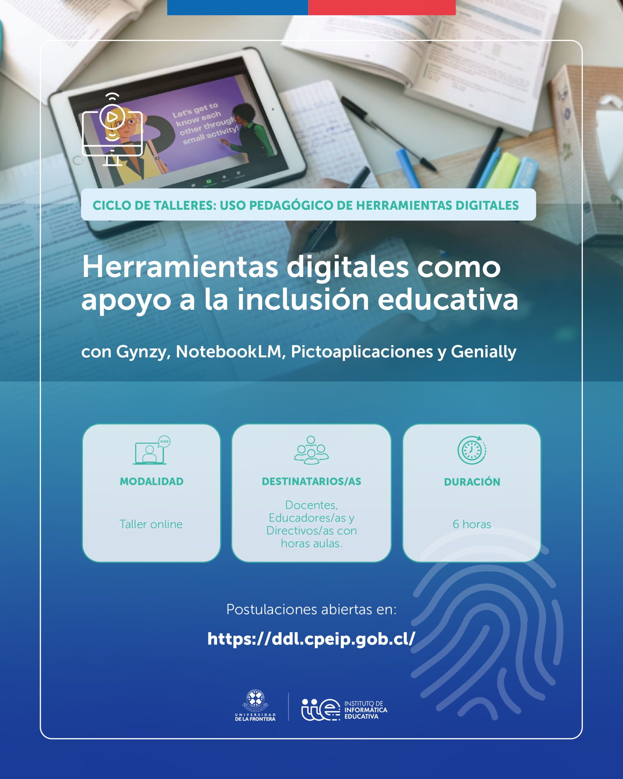 Este taller de 3 sesiones tiene como propósito que las y los docentes conozcan, exploren y utilicen herramientas digitales específicas para favorecer la inclusión educativa en sus aulas y atender diversas necesidades educativas especiales, promoviendo un aprendizaje más accesible, motivador e inclusivo.