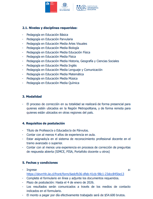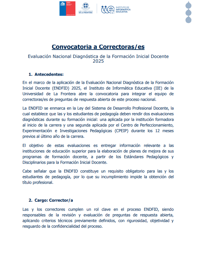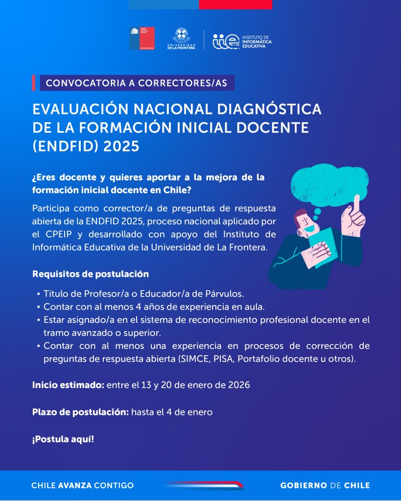 El Instituto de Informática Educativa de la Universidad de La Frontera invita a postular al cargo de corrector/a de preguntas de respuesta abierta de la Evaluación Nacional Diagnóstica de la Formación Inicial Docente (ENDFID) 2025, proceso nacional aplicado por el IIE.
