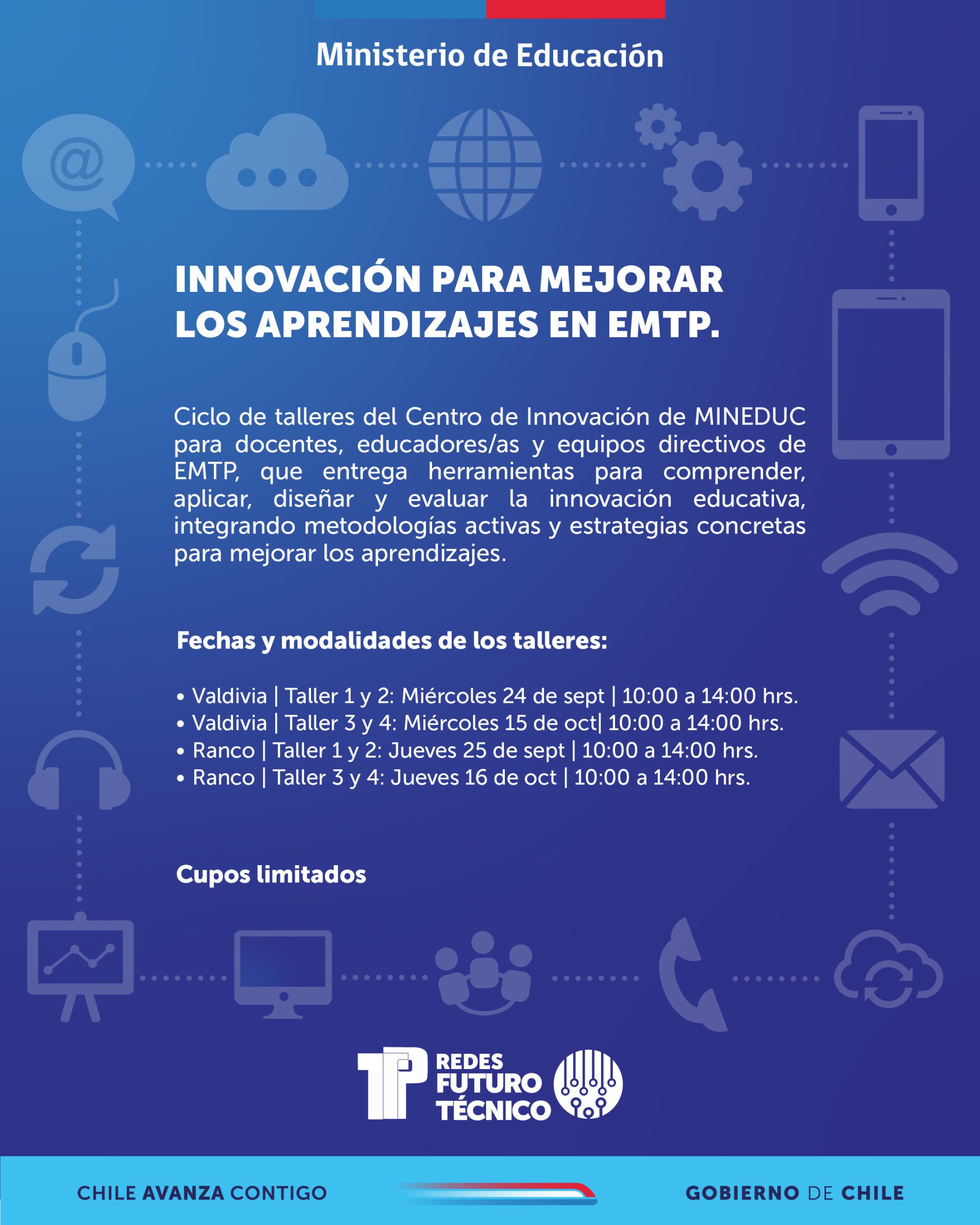 Ciclo de talleres del Centro de Innovación de MINEDUC para docentes, educadores/as y equipos directivos de EMTP, que entrega herramientas para comprender, aplicar, diseñar y evaluar la innovación educativa, integrando metodologías activas y estrategias concretas para mejorar los aprendizajes.