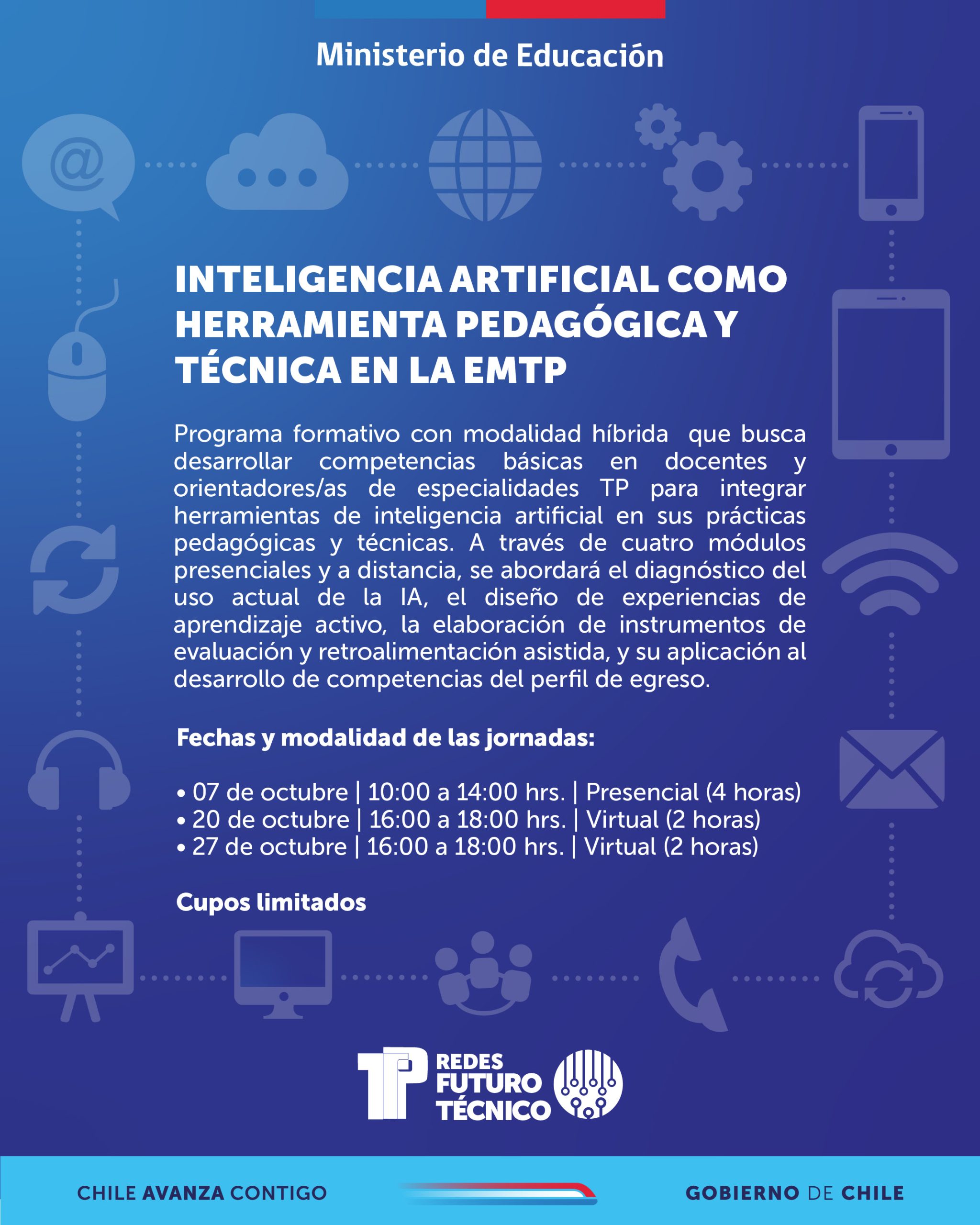 Programa formativo con modalidad híbrida que busca desarrollar competencias básicas en docentes y orientadores/as de especialidades TP para integrar herramientas de inteligencia artificial en sus prácticas pedagógicas y técnicas. A través de cuatro módulos presenciales y a distancia, se abordará el diagnóstico del uso actual de la IA, el diseño de experiencias de aprendizaje activo, la elaboración de instrumentos de evaluación y retroalimentación asistida, y su aplicación al desarrollo de competencias del perfil de egreso.